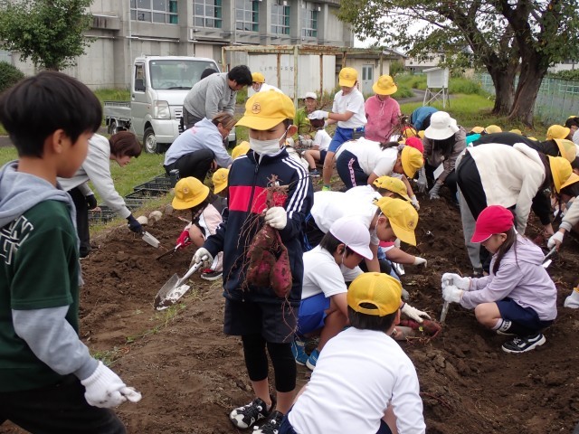 しのはらチャレンジ隊の活動です。2時間目後の休み時間に3・5年生が、昼の休み時間に2・4・6年生がいもほりをしました。予想以上にたくさん収穫でき、楽しく活動できました。また丸々と大きく育ったいもも多く、ほるのが大変なくらいでした。たくさん収穫できてよかったですね。