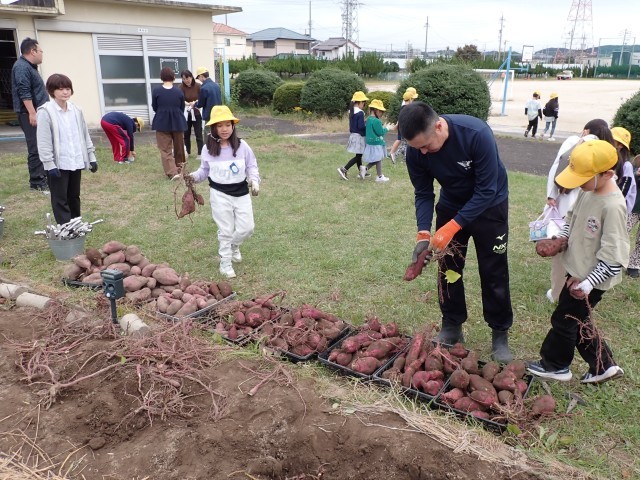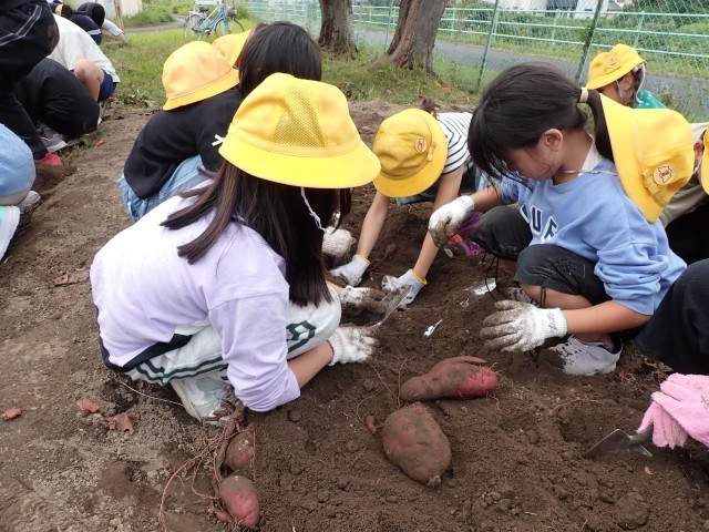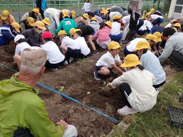 このさつまいもは、児童チャレンジ隊の皆さんとスクールボランティアさん、PTA執行部・学年委員さん、教頭先生が力を合わせて、春から育ててきたものです。草取りや水やりもしました。子どもたちのために活動していただいた皆さんありがとうございます。