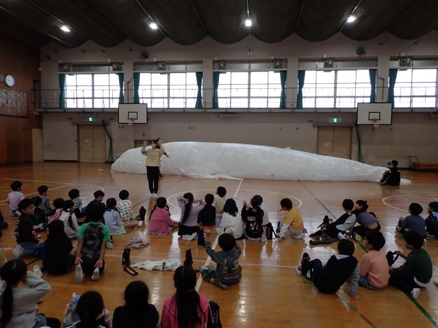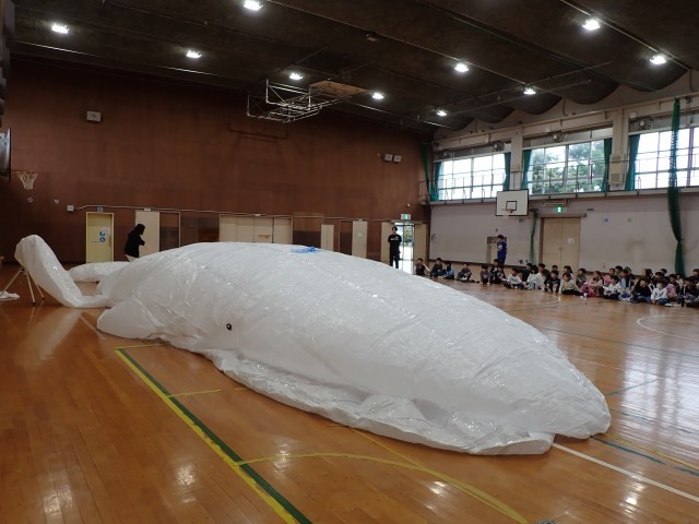 昨日はあいにくの空模様、一面厚い雲に覆われていました。しかし、子どもたちの呼びかけに、「くじらぐも」がこたえてくれました。体育館の扉を開けると、お話に出てくる「くじらぐも」が現れました。大喜びの子どもたち、「くじらぐも」の中をのぞいたり入ってみたり、上に乗ってみたりしました。出会えてよかったですね。