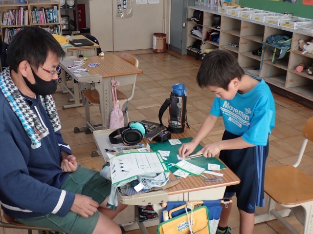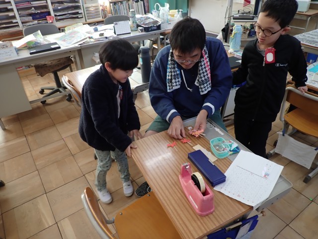 図工の学習です。粘土での作品作り、カッターナイフを使う練習、切ってできた木片を組み合わせての作品作りなど、個別の課題に取り組んでいました。