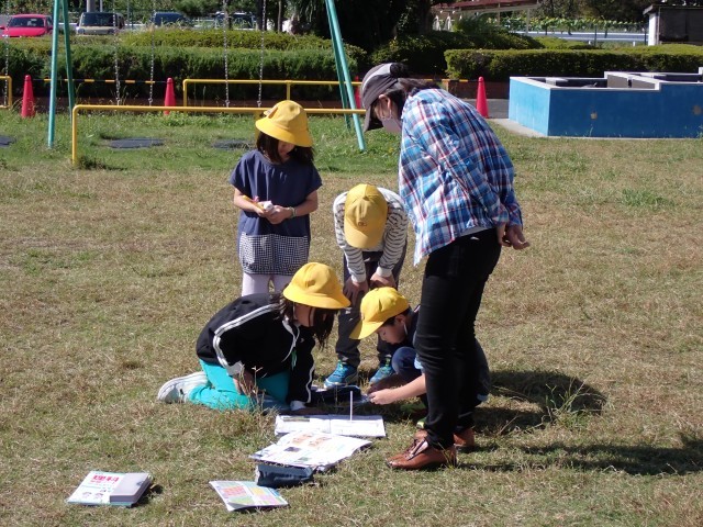昨日は久しぶりに快晴でした。理科「太陽とかげ」の学習では、太陽の向きと影の向きとの関係を調べました。方位磁針を使って方位を調べ、地面に立てた棒の影の位置を記録しました。