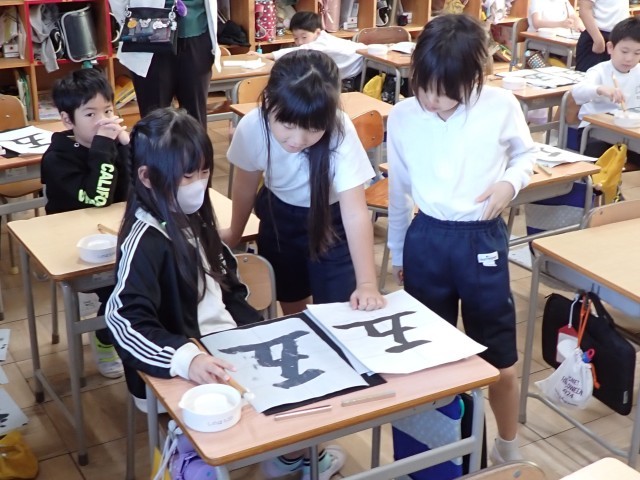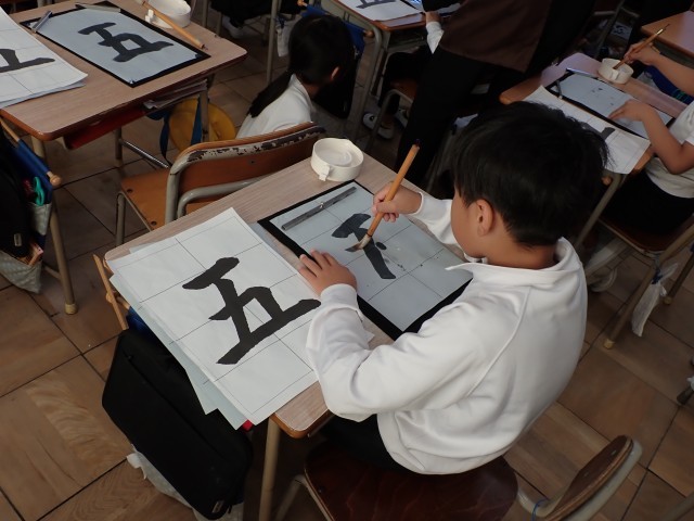 書の時間の学習です。この日は、水習字に取り組み、『五』を書きました。筆の持ち方、姿勢、「おれ」の筆使い、横画の向きなどに気を付けて練習し、書き終えると席が近くの友だちと評価し合いました。