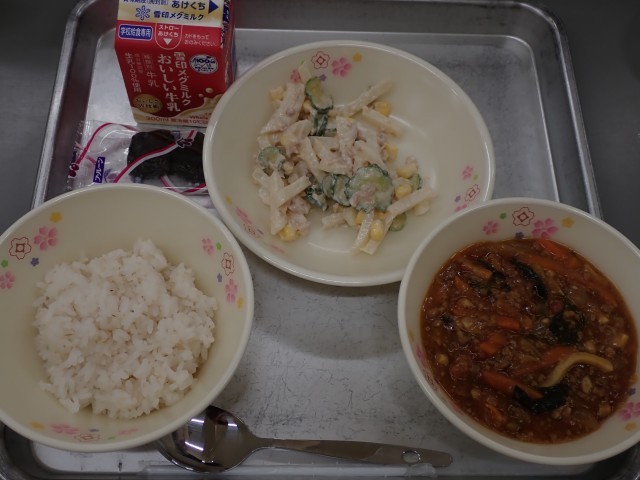 献立は、麦ご飯・牛乳・きのこのキーマーカレー・シャキシャキポテトサラダ・プルーンでした。