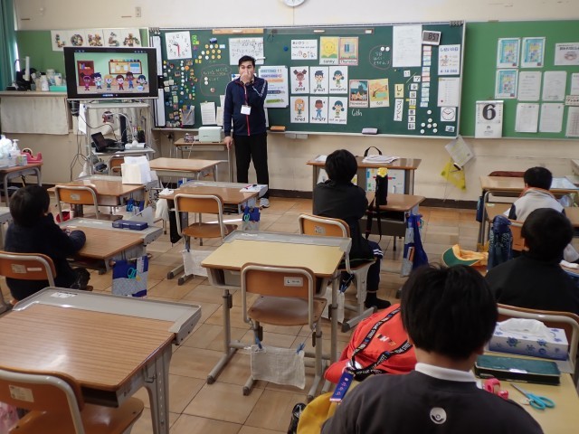 外国語活動の学習です。ALTさんとのやりとりを楽しみながら、挨拶・アルファベット・色・数字・国などを表す言葉や、問いかけや答え方の表現を学びました。