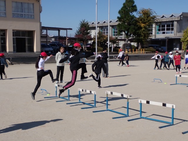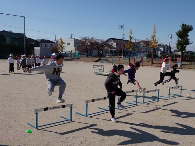体育の外部講師さんをお招きしての体力向上出前授業の2回目です。今回は「ハードル走」です。足の動かし方を練習した後、ハードルの高さやハードル間の距離が異なるレーンから、自分が走りやすいレーンを選択して走りました。