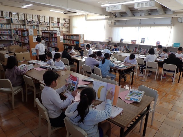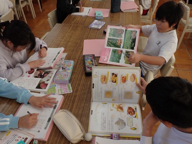 『食べ物のひみつを教えます』では、大豆のように姿を変えて食品の材料になる食べ物の中から、自分が興味をもったものを調べて説明する文章を書きます。学習課題は、「説明の工夫」を使って、読む人に分かりやすいと思ってもらえる文章を書くことです。この時間は、図書室の本を読み、情報収集をしました。