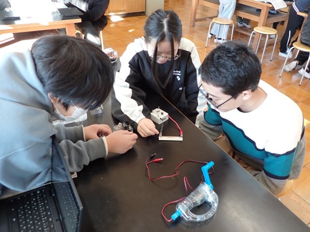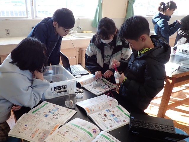 この時間は「電気の利用」について学習しました。手回し発電機で電気をつくり、それをコンデンサーにためました。その電気を光、音、運動、熱などに変えて利用することができるかを、実験を通して確かめました。また「電気の有効利用」の視点から、豆電球と発光ダイオードの使用電気量の違いを比べました。