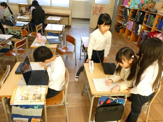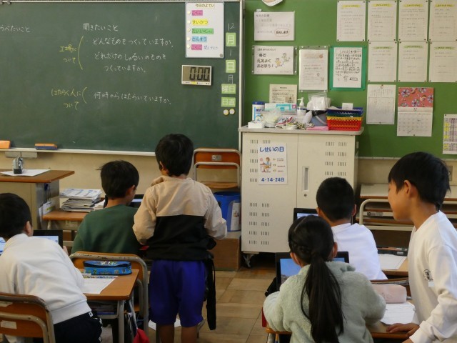 写真は、先生の話を聞いたりホームページを見たりしながら、「まちたんけん」で調べたいことや聞きたいことを、ワークシートに記入しているところです。
