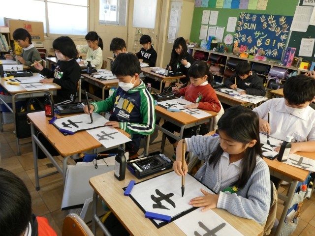 書の時間に作品づくりをしました。「来年(うまどし)の目標を書く」が学習課題です。