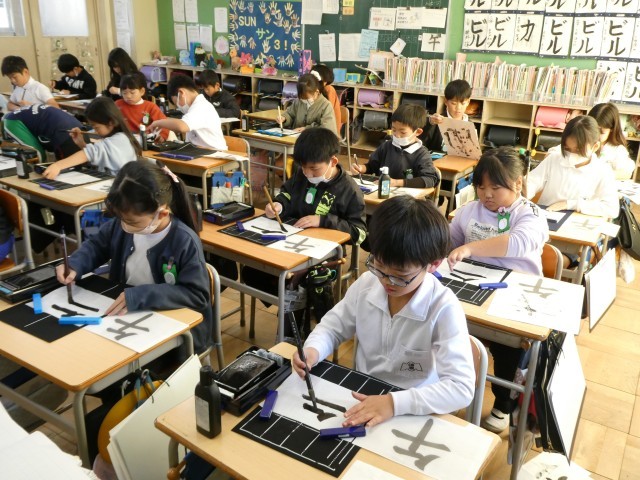 今週は、毛筆で「午(うま)」という字を書きました。これまでに学習した「はらい・横画・縦画の筆遣い」を思い出し、自分らしい字を目指しました。