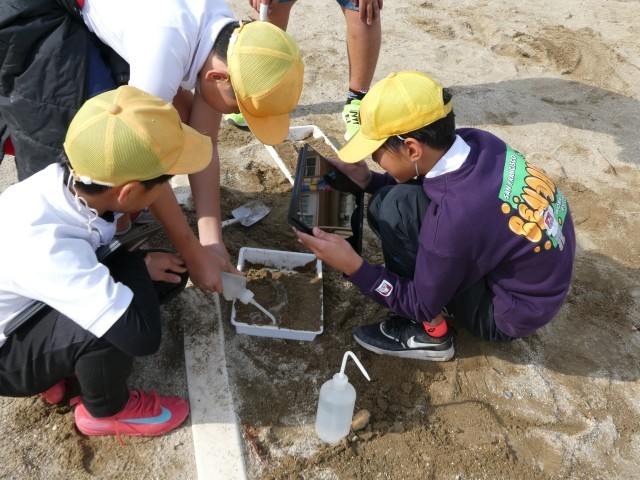 子どもたちは班で協力して実験を行い、流す水の量を変えて、土の削られ方や運ばれる土の量を比べました。また、考察したりまとめたりするために、実験の様子を動画に記録しました。