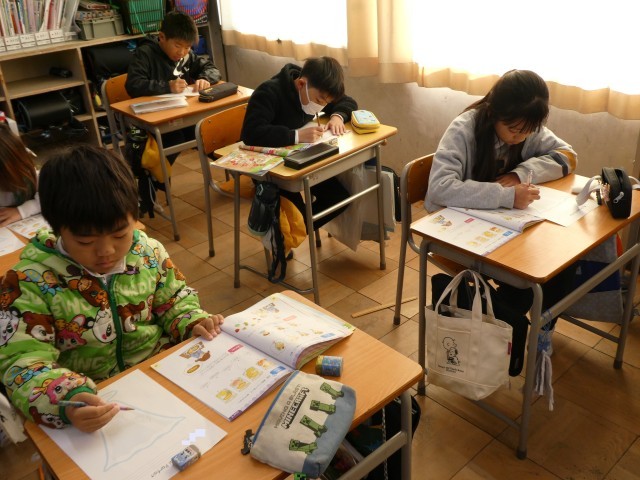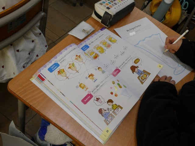 この時間の前半は、市場の様子の映像を視聴したり、歌やゲームを通して果物や野菜の言い方を練習しました。後半は、オリジナルパフェづくりを始めました。