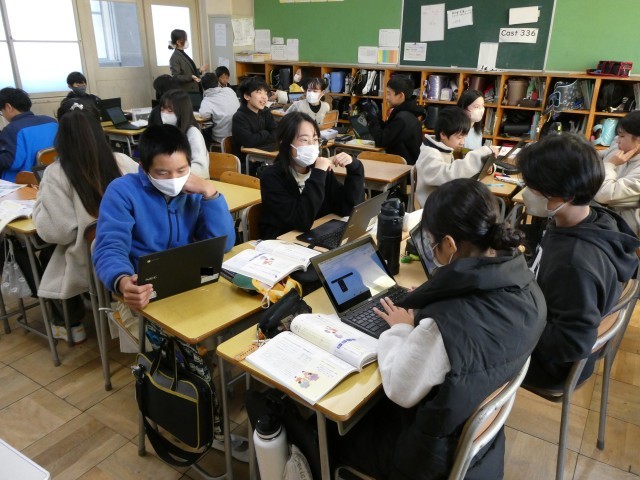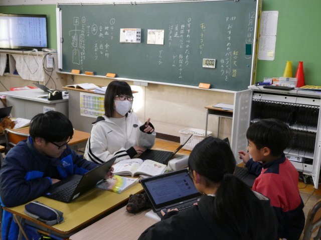 まず、教科書を読んで、相手や目的を明確にして推薦する文章を書きパンフレットをつくること、グループで行うこと、引用したり写真や図表を用いたりして書き表し方を工夫することなど、学級全体で学習課題、目標、学習の進め方などを捉えました。続いてグループでテーマを決め、どんな人にどんなものを推薦するかの案を出し合いました。出てきた案を、グループでどう決定していくかを真剣に話し合っていました。