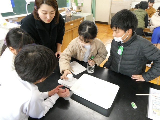 この時間は「体積が同じでも、物によって重さはちがうのか」を調べることが課題でした。実験では、見た目が似ている塩と砂糖を使いました。同じ大きさの入れ物に、体積が同じになるようにそれぞれを入れ、電子てんびんで重さを量って比べました。