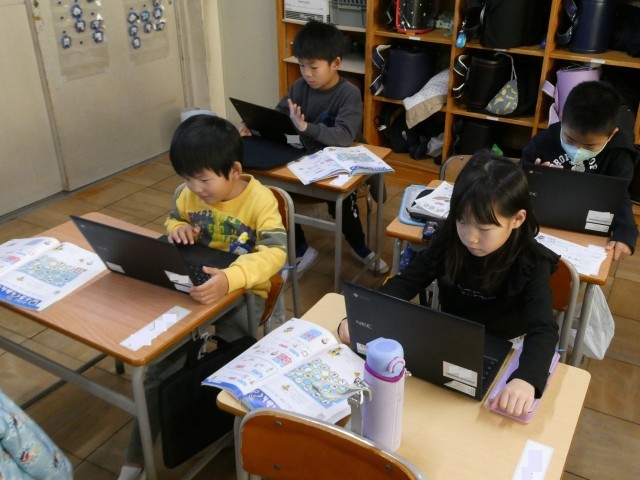 算数「わくわく ぷろぐらみんぐ」の学習では、ロボットを動かす簡単なプログラムをつくりました。平面上での物の位置の表し方を学び、ロボットを上下左右に動かす方法を考えました。