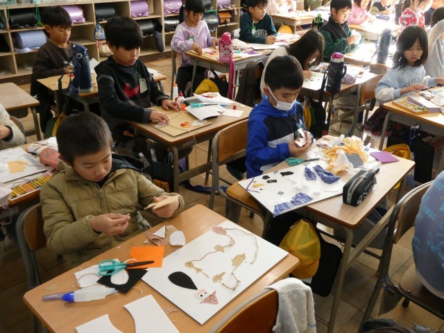 子どもたちは、布の特徴を感じ取って生かしてみたいことを考えたり、台紙に置いた布を動かしながらイメージを広げたりして、楽しく表していました。