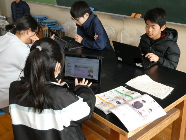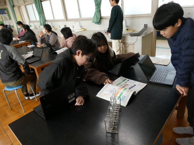 はじめの学習は、水溶液の違いを調べます。食塩水、重曹水、うすい塩酸、うすいアンモニア水、炭酸水のいずれかが入った試験管5本が用意され、それぞれの水溶液は何かを、予想や仮説を立て、実験をします。写真は、実験方法を考えたり話し合ったり、それを整理している様子です。