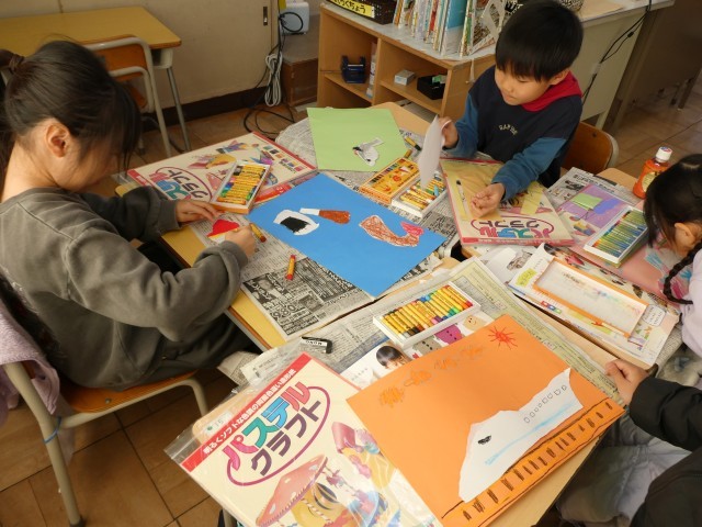 様々な形や大きさに破れた画用紙がたくさん用意されています。まず、その画用紙から何枚かを選び、その形が何に見えるかを想像しました。さらに、台紙の上に向きを工夫しながら置いてみることで、自分が表したい世界をイメージしていきました。その後は、画用紙にクレヨンで色をぬり、動物,魚,乗り物,食べ物,山などを誕生させていきました。