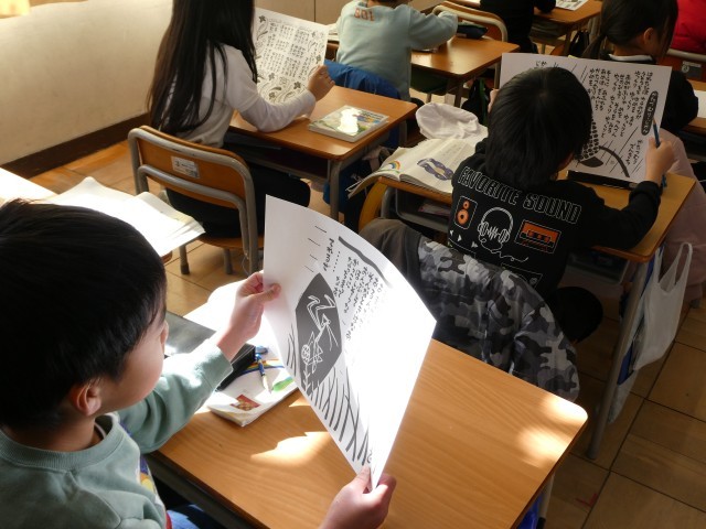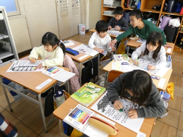 この時間の学習では、選んだ詩のシートが配付されました。子どもたちは、詩を読んだり、シートの絵に色付けをしたりしました。これから音読の練習を重ねて、みんなの前で堂々と読めるようにしていくそうです。