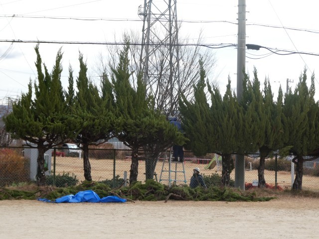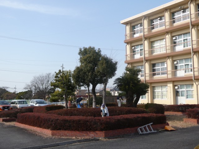 春日井市教育総務課の現業員さんに、職員駐車場横の築山、運動場東側の生垣の一部、ふれあいの庭の環境整備をしていただきました。とてもきれいになりました。2日間の作業、ありがとうございました。