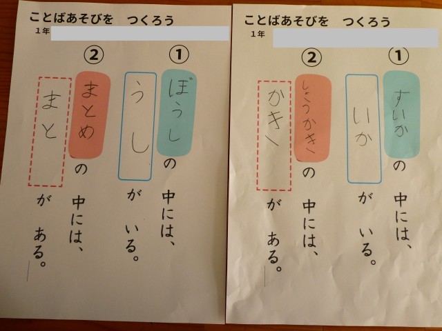 「かばんの中には、かばがいる。」「みかんの中には、かんがある。」のような「〇〇△の中には、〇〇がいる(ある)。」ということばが隠れている文をつくりました。
