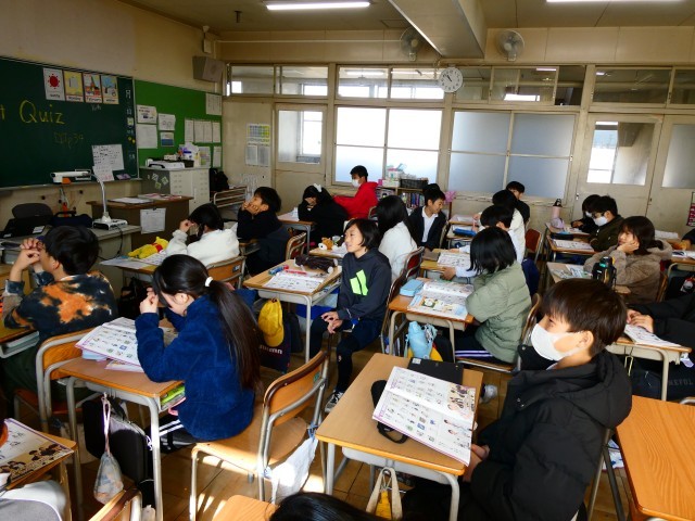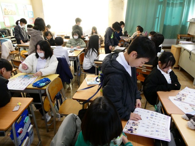 この時間は、様々な職業の英語での言い方をALTさんといっしょに練習したり、班対抗クイズ形式で職業を説明する簡単な語句や基本的な表現を聞き取ったりしました。