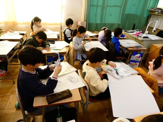 この時間は、片面波段ボール,エアーキャップシート,糸クレープ紙,ネットキャップ,毛糸などの材料を切って、二つ折り台紙に貼り付けて「版」をつくりました。材料の感じを生かしたり組み合わせを工夫したりしながら作業を進めました。