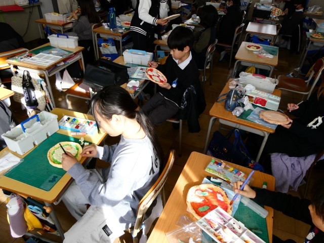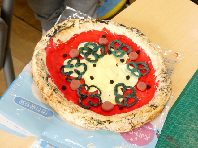 図工の学習です。軽量粘土を使っての「焼きたてピザ」が出来上がりました。