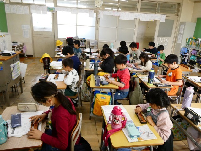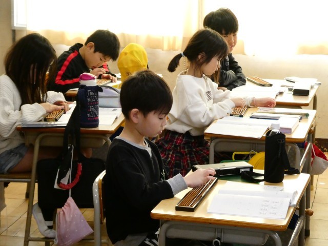 まずは、そろばんがどんな道具かを知り、そろばんを使っての「数のよみ方、入れ方、はらい方」を練習しました。