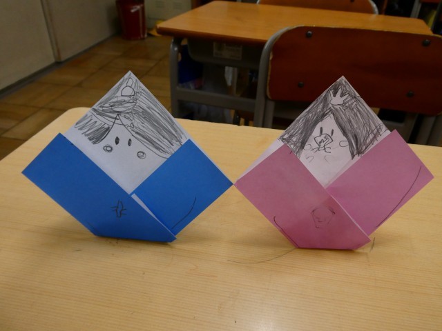 校内の様子と給食メニューです。折り紙の雛人形は、1年生が作りました。