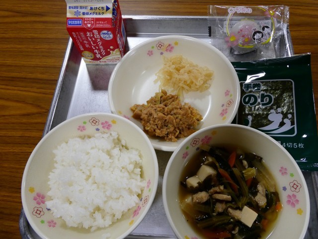 今日の給食は、「桃の節句」の行事食でした。献立は、ご飯,牛乳,三つ葉入り五目汁,まぐろの甘辛煮,刻みたくあん,手巻海苔,いがまんじゅうでした。西三河地域では「いがまんじゅう」を桃の節句に食べる習わしがあるそうです。