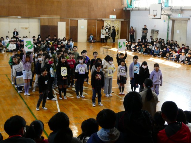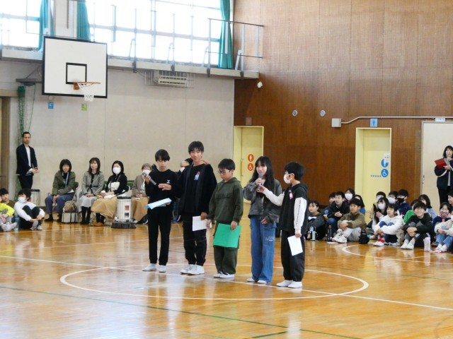 出し物の後は、通学班,なかよし班活動,委員会活動の引継ぎ式を行いました。6年生代表から5年生代表へ、応援の言葉と共に各活動が引き継がれました。