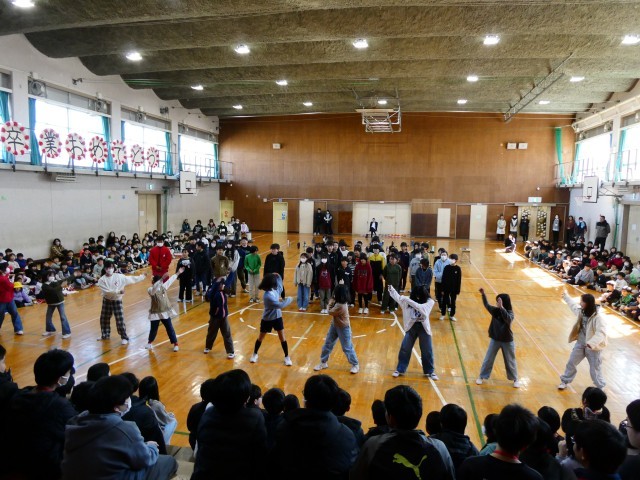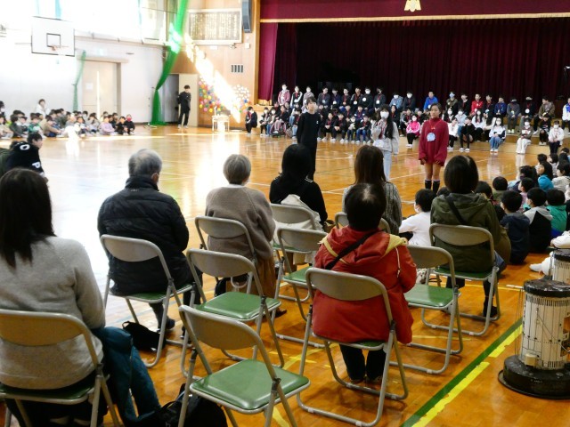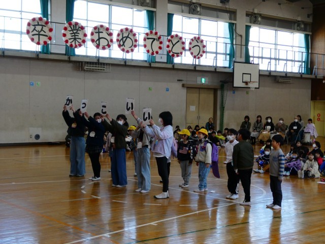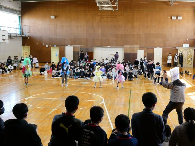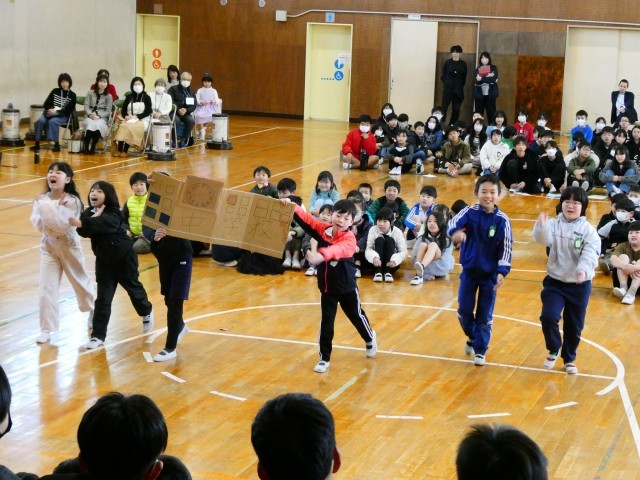 6年生が1年生と一緒に入場し、会はスタートしました。地域ボランティアさんへの感謝の言葉の後は、劇,ダンス,歌,クイズ,群読などの各学年の出し物やメッセージを6年生に贈りました。どの学年も、子どもたちと先生がアイデアを出し合って準備をしてきたので、これまでの感謝と卒業をお祝いする気持ちをしっかりと伝えることができました。