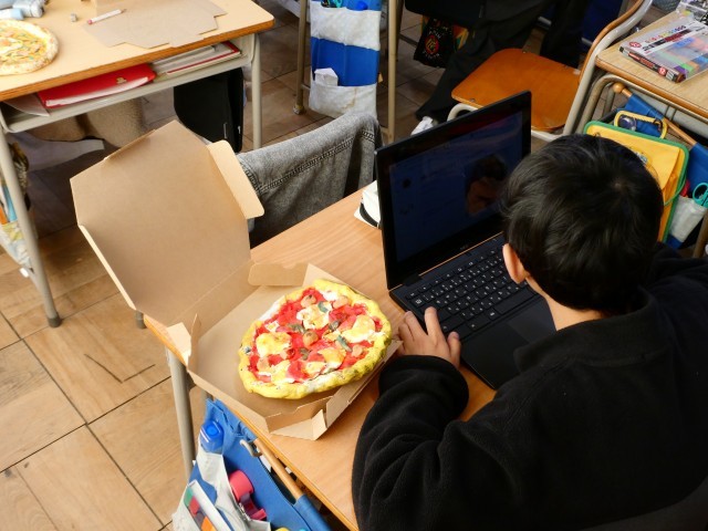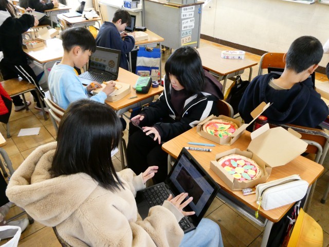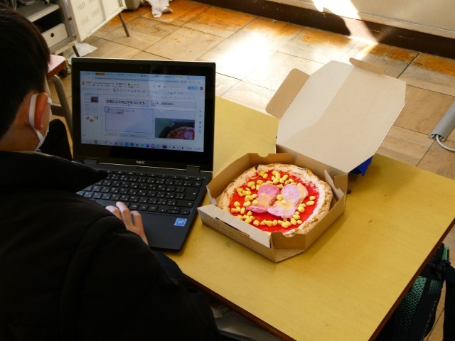 この時間は、自分のつくったピザの写真を撮り、作品カードに貼り付け、「工夫したところ」「時間をかけた、こだわったところ」も文章入力しました。