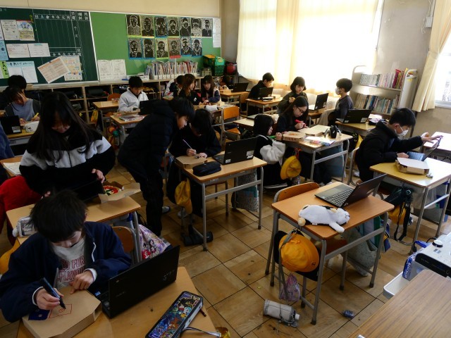 作品カードが出来上がった人は、ピザ持ち帰り用の箱を装飾し、更に本格的なピザに仕上げました。