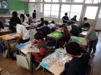 4の2では、図画工作科「コロコロガーレ」に取り組みました。子どもたちは、自分が作ったコースや建物の中にビー玉を入れて、作品を傾けながらビー玉の動きを見つめていました。中には作品を傾けすぎてビー玉を落としてしまい、探すのに苦労している子もいました。