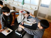 理科室では、4年生が理科の実験中です。問題は、「空気はあたためられたり冷やされたりすると体積が変わるのか」です。試験管の中の水の目印が上がったり下がったりする様子を、興味をもって見ていました。