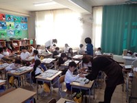 書の時間の学習です。この日は、水習字に取り組み、『五』を書きました。筆の持ち方、...