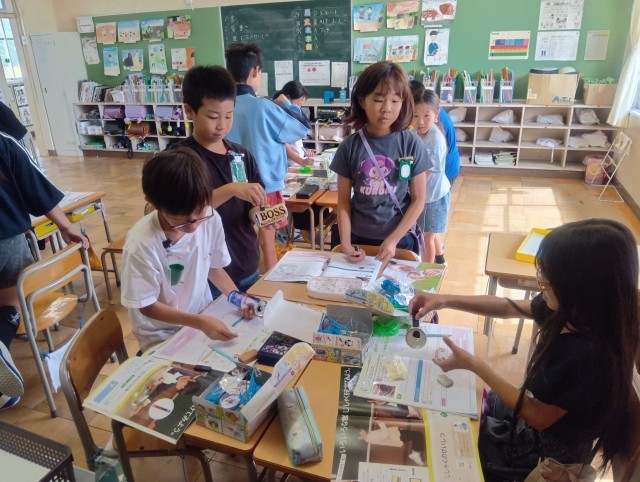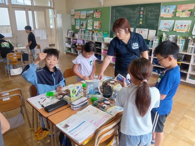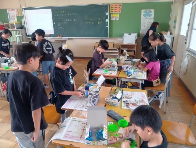 じしゃくにつくもの、つかないものを調べました。身の回りのものに、じしゃくを近づけていきました。準備してあったアルミ缶やスチール缶は、表面の塗装を削って近づけてみました。
