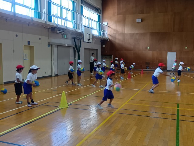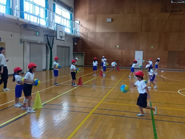 ドリブルの練習をしました。その場でドリブルをするのが上手になったので、次は走りながらやってみました。