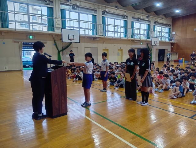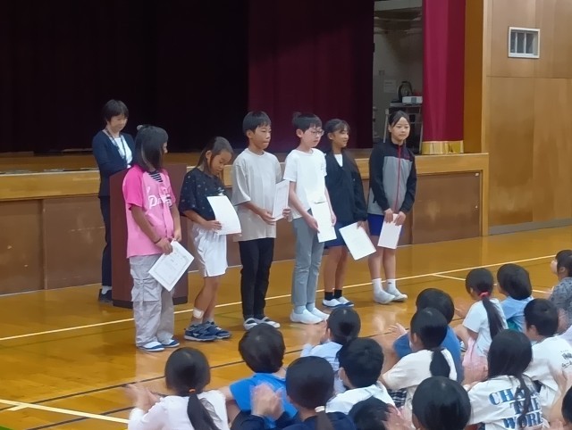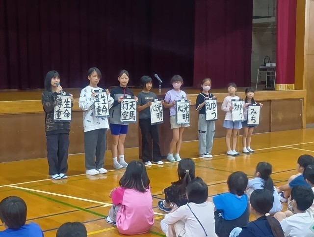 また、10月25日に小野小学校で行われる席上揮毫大会の代表児童を応援する「激励会」を行いました。当日は、これまでの練習の成果を出せるように精一杯頑張ってほしいです。