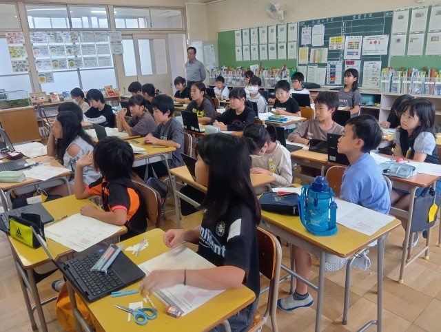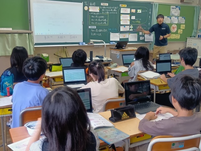平行四辺形の面積の求め方を考えました。これまでに学習した図形の公式を使って求められないか考えました。たくさんの考えが児童から出ました。