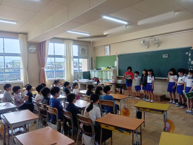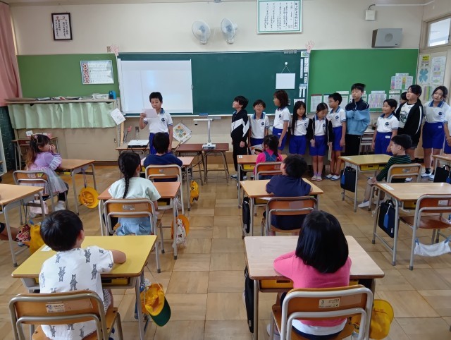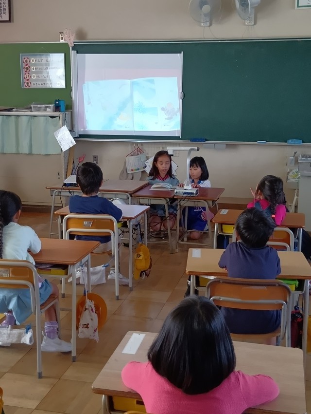 今日は、実際に1年生の教室に行き、クラスで決めた1冊の本の読み聞かせを行いました。