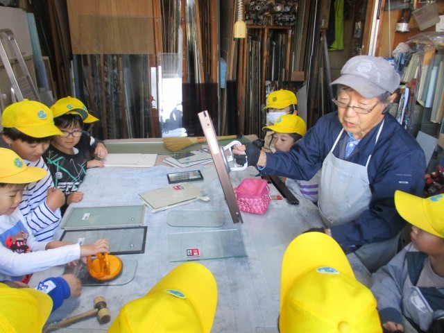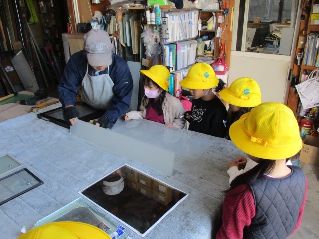 校区内にある「高蔵寺ガラス」を見学しました。ガラスや扉や鍵を修理する道具などを見せてもらいました。とても興味深く見学をする姿が見られました。