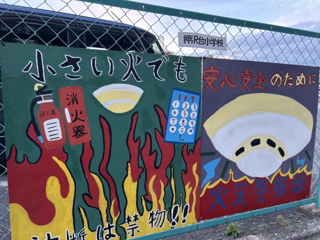 少年消防クラブの活動の一環として、夏に代表児童が防火看板を作成しました。授業後に学校に残ったり、休み時間や給食後の時間なども使って楽しみながら作成してくれました。最後の仕上げまで粘り強く仕上げる姿は本当に立派でした。