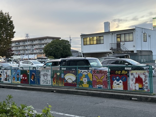この看板が、他校児童の作品とともに、今日から春日井市役所の北駐車場に展示されています。多くの市民の方々にご覧いただき、市内の火事や被害が減っていくことを心から願っています。