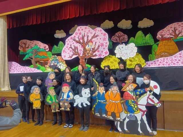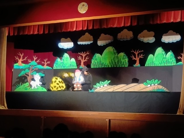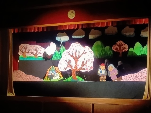 本ボラかあさんによるペープサート「花さかじいさん」が上演されました。子どもたちがよく知っているお話ですが、児童は美しいペープサートや、本格的なセリフ、音楽、照明などに魅了されていました。
