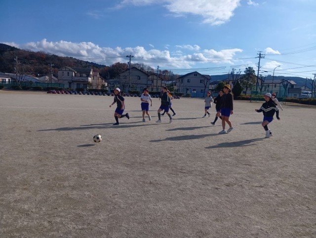 男子と女子に分かれてサッカーをしました。男子は大きなコートで行い、女子は人数が少ないので小さなゴールを目指しました。コート全体を使ってしっかり動きました。