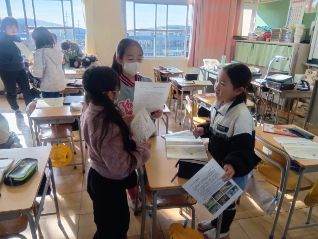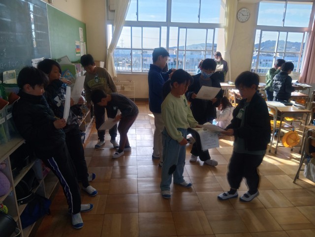 自分が住む市や町のどんなところが好きかを紹介する文を書きました。完成したので、交流会をしました。友達の紹介文を聞き、よいところや感想を伝え合いました。