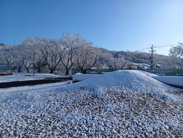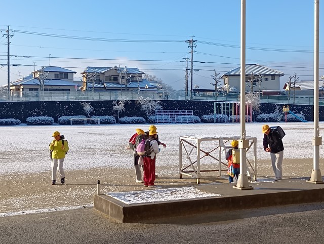 今朝、児童が登校してくると、校庭にはうっすらと雪が積もっていました。